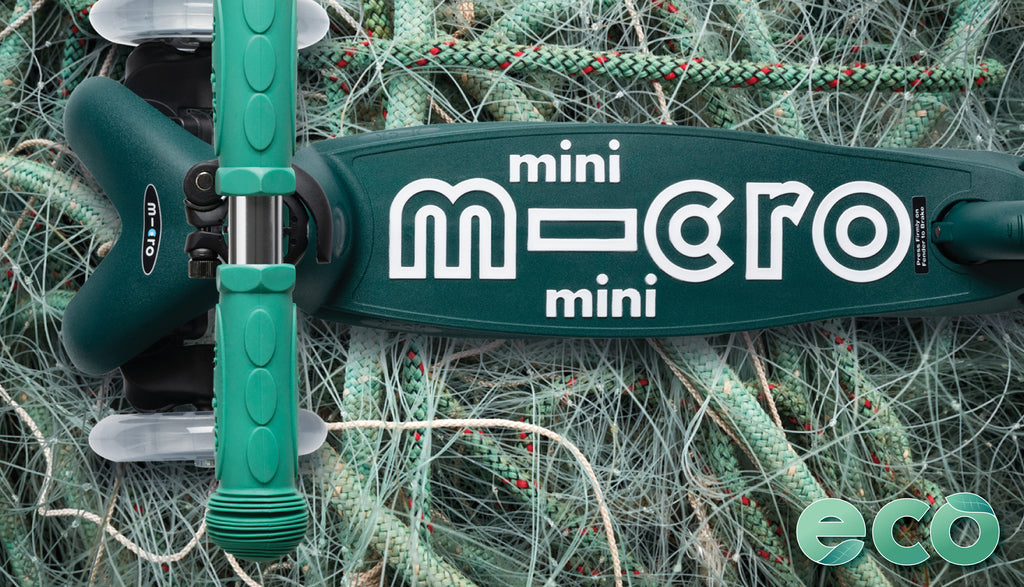 Vi har udviklet en ECO-serie, hvor fodpladen og bremsen er fremstillet af genanvendt plast fra havene, såsom fiskenet, reb og andet affald fra den maritime industri. Omkring 10% af plastaffaldet i havene kommer fra fiskeri. Hvert år efterlades omkring 640.000 ton net og andet fiskeudstyr i havene. En del af dette affald, som indsamles på lossepladser og derefter genanvendes, bruges til at fremstille Micro løbehjul fra serien ECO.