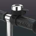 God og holdbar ringeklokke til løbehjul og cykler med en fleksibel, sort silikonerem og en sort klokke.